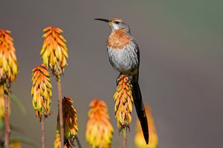 Adéntrate en el mundo de la observación de aves en el observatorio de aves de Geelbek, en el Parque Nacional de la Costa Oeste. Muy cerca del puerto de Saldanha se extienden las aguas turquesas de la laguna de Langebaan, el verdadero corazón del parque. Cada año, se reúnen aquí más de 250 especies, lo que supone más de una cuarta parte de todas las aves de Sudáfrica. Con los cambios de marea, aves limícolas como el correlimos gordo, el tridáctilo o la aguja colipinta se acercan a la orilla, mientras que flamencos, pelícanos e incluso el escurridizo águila pescadora completan la escena. La visita, guiada por expertos, dura unas cuatro horas y es una experiencia imprescindible para quienes disfrutan de la ornitología. No olvides reservar con antelación.