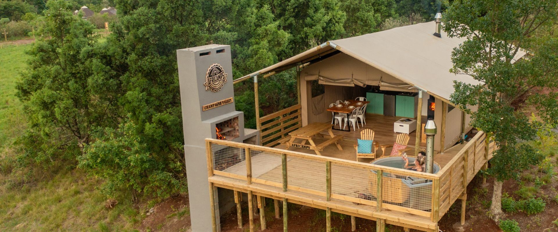 En pleno valle de Champagne, en los montes Drakensberg, se encuentra AfriCamps Champagne Valley, un campamento estilo glamping que combina comodidad y naturaleza. Sus tiendas, con capacidad para hasta cinco personas, cuentan con dos dormitorios, chimenea, cocina equipada (fogón de cuatro fuegos, microondas y nevera) y baño privado con ducha. Cada una dispone de una terraza de 30 m² con mesa de pícnic, tumbonas, zona de barbacoa y un jacuzzi de leña al aire libre. Además, tienen wifi, para que puedas compartir la foto del brindis con el atardecer de fondo.
