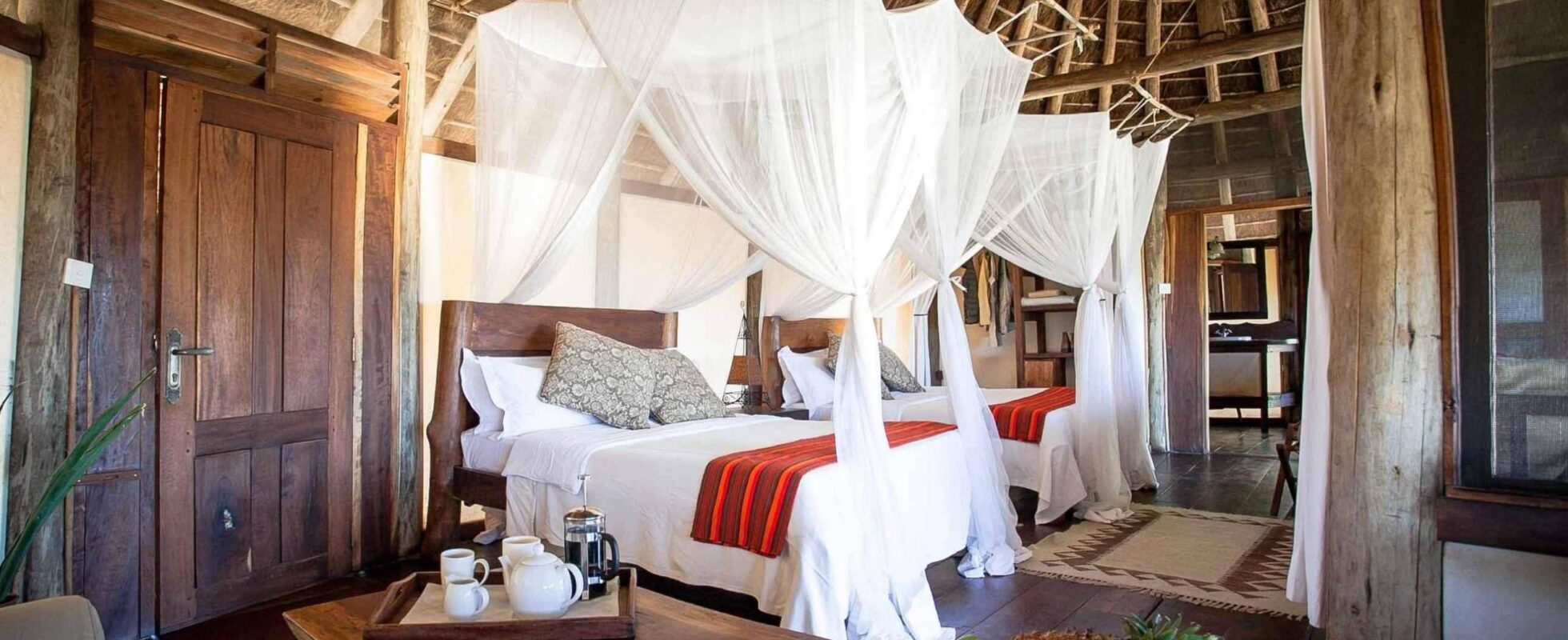 Bellamente escondido en el Parque Nacional del Valle de Kidepo, rodeado de extensas sabanas y majestuosas montañas, se encuentra Apoka Safari Lodge. Este lujoso alojamiento en medio de la naturaleza salvaje cuenta con diez habitaciones elevadas, decoradas con un encanto rústico, paredes de lona y techos de paja. Todas las habitaciones están adornadas con muebles de madera hechos a mano y equipadas con duchas interiores con vistas, balcones con asientos para admirar el entorno, cómodos sofás y camas. Lo más especial del alojamiento son, sin duda, las bañeras exteriores construidas con piedra, con vistas a la sabana de Kidepo. La piscina comunitaria también está hecha de piedra y ofrece las mismas vistas inolvidables. Con un poco de suerte, es posible avistar animales acercándose a la zona. Por último, pero no por ello menos importante, los huéspedes alaban la calidad de la comida servida en el salón principal, bajo techos de paja. Encontrar todo esto en medio de la nada hace que este alojamiento parezca un verdadero espejismo.
