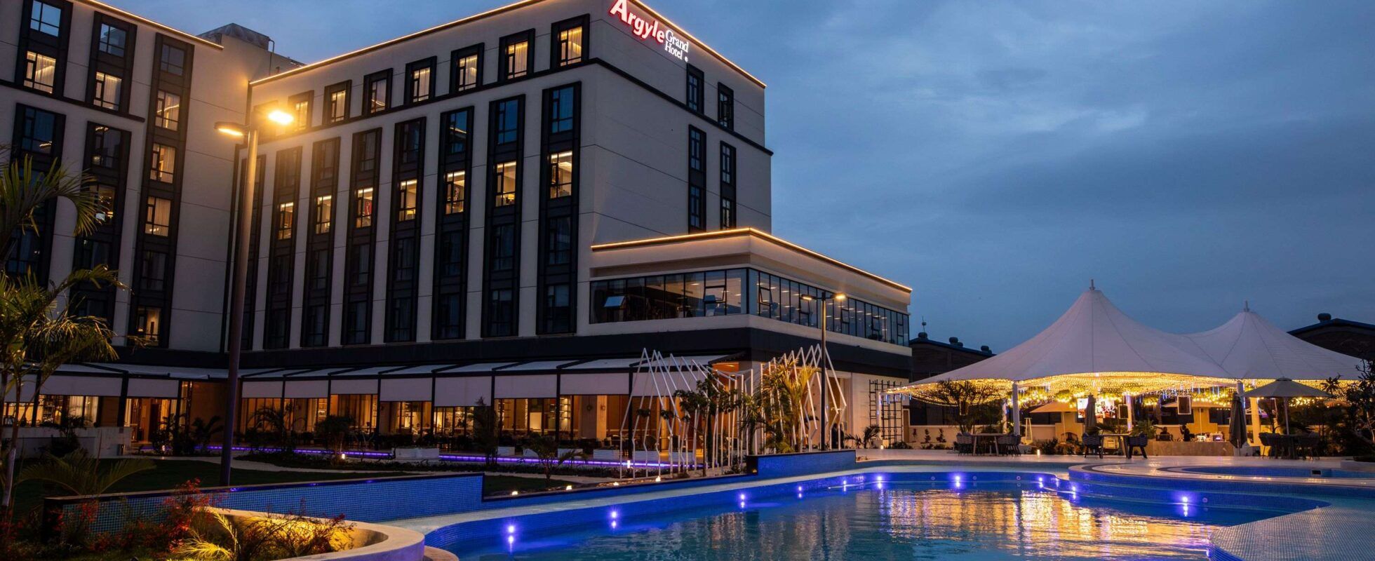 Argyle Grand Hotel es un alojamiento de lujo situado a pocos minutos del Aeropuerto Internacional Jomo Kenyatta de Nairobi. Cuenta con más de 200 habitaciones smart distribuidas en varias plantas. El alojamiento se caracteriza por su decoración moderna que incorpora sensores de movimiento que iluminan el espacio al entrar y un panel junto a la cama para controlar la iluminación y cerrar las cortinas eléctricas. El hotel dispone de gimnasio, una gran piscina climatizada al aire libre, un bar, un restaurante principal y otro junto a la piscina, ambos cuentan con opciones para todos los gustos. En definitiva, no hay mejor opción para empezar o terminar tu aventura en Kenia.