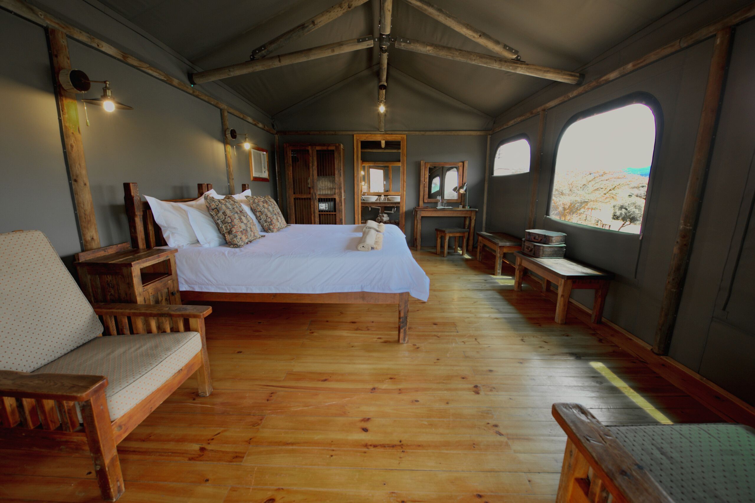 A solo seis kilómetros y medio de Oudtshoorn, conocida como la «capital mundial del avestruz», se encuentra Buffelsdrift Game Lodge, un alojamiento exclusivo de tiendas de campaña, ideal para quienes desean reconectar con la naturaleza. El complejo cuenta con 20 tiendas-suites y cuatro unidades familiares con dos dormitorios, todas con baño privado con ducha y bañera independiente, así como una ducha exterior privada, camas de matrimonio extragrandes o gemelas, aire acondicionado, minibar y caja fuerte digital. Asimismo, cada tienda tiene su propia terraza para que tomes el sol en total tranquilidad o contemples el amanecer y la fauna local con una bebida en mano. Date un baño en la piscina o un capricho en el spa, y visita el restaurante Buffelsdrift para disfrutar de un delicioso menú a la carta de comidas caseras elaboradas con productos locales mientras contemplas la charca cercana y a todos los animales que atrae.