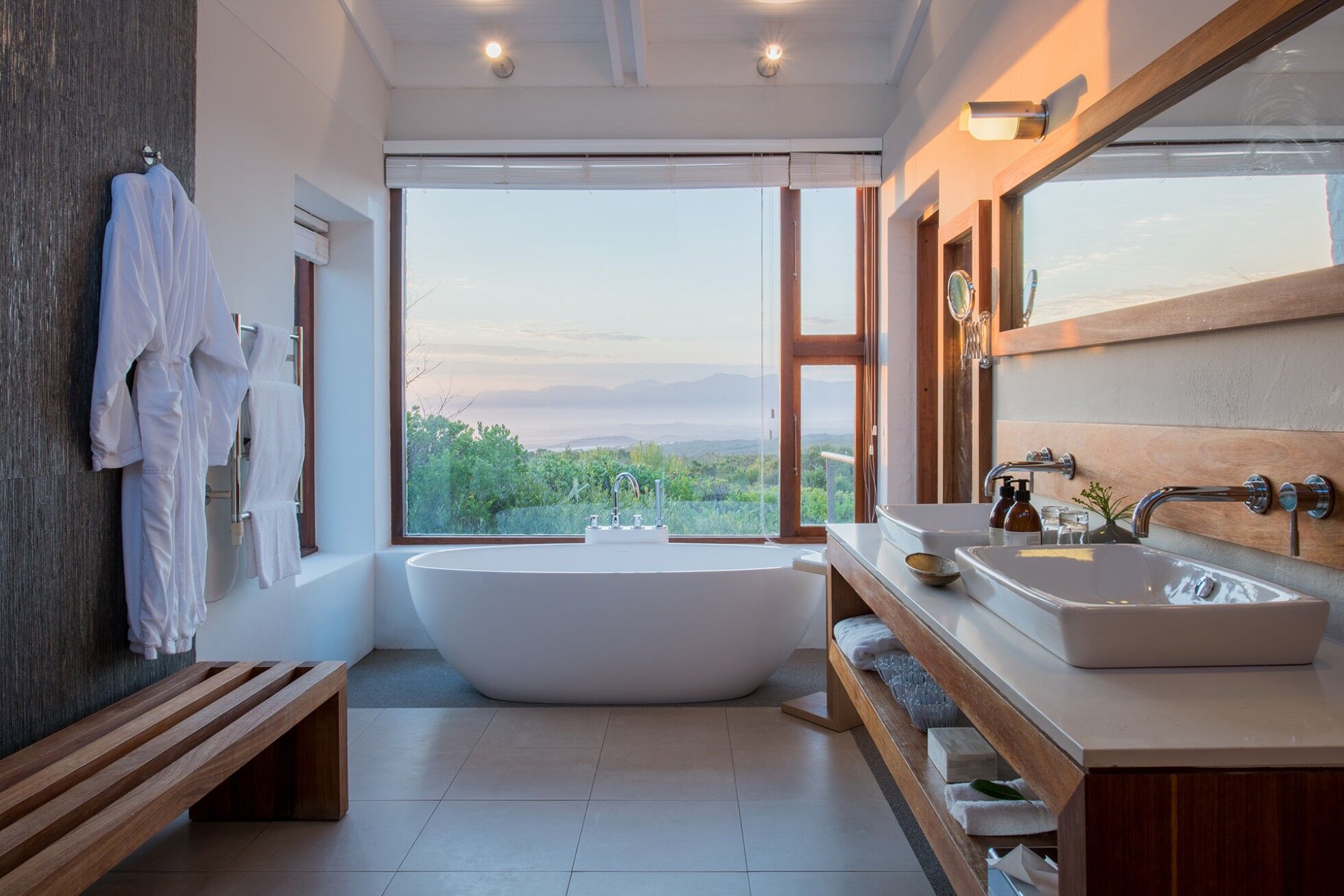 Grootbos Private Nature Reserve es una reserva natural ecológica con alojamiento, situada cerca de la bahía de Walker, en Gansbaai. Dispone de 27 suites y 2 villas privadas de diferentes categorías, repartidas en dos zonas, todas ellas con chimenea, baño privado y vistas al fynbos o al mar. Las instalaciones también se distribuyen entre las dos zonas —Garden Lodge y Forest Lodge— e incluyen piscina infinita, gimnasio, sauna, sala de cine e incluso un espacio de juegos infantil en el bosque. La experiencia gastronómica en Grootbos combina sabores locales con toques gourmet: desde mariscos frescos hasta tortellini artesanales y una bodega con una amplia selección de vinos.