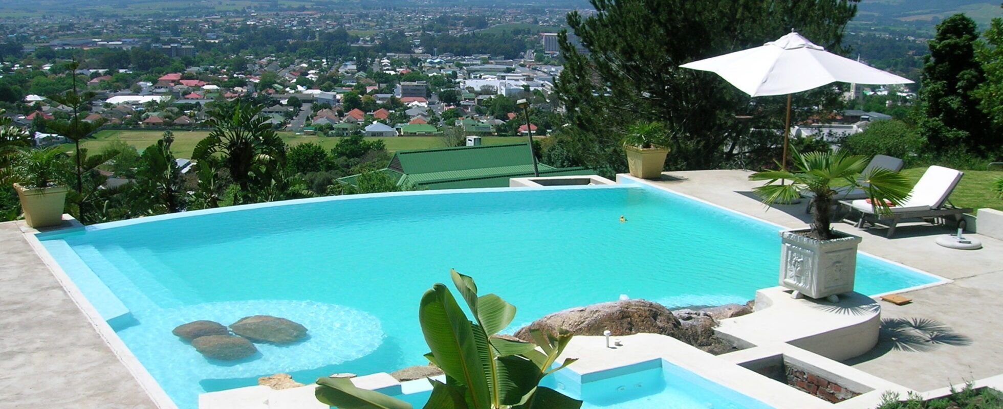 Perle-du-Cap está situado en Paarl (o más bien en «la perla de Cape Winelands», como tienden a llamarla los lugareños), en la cima de una colina, rodeado de una vegetación exuberante y cascadas. Se trata de un elegante Bed & Breakfast (alojamiento y desayuno) que pese a estar a solo unos minutos del centro histórico de la ciudad, su ubicación elevada le otorga una paz y tranquilidad excepcionales y vistas espectaculares sobre el valle y la montaña Paarl. Cuenta con cinco habitaciones dobles cálidas y sofisticadas, todas con baño privado y equipadas con comodidades modernas como aire acondicionado, un minibar completamente surtido, cafetera, tetera, televisión y wifi. Comienza tu día con un desayuno gourmet, zambúllete en la piscina infinita con agua de manantial pura que desciende de la montaña Paarl, o toma el sol en la terraza, ¿qué más se puede pedir?