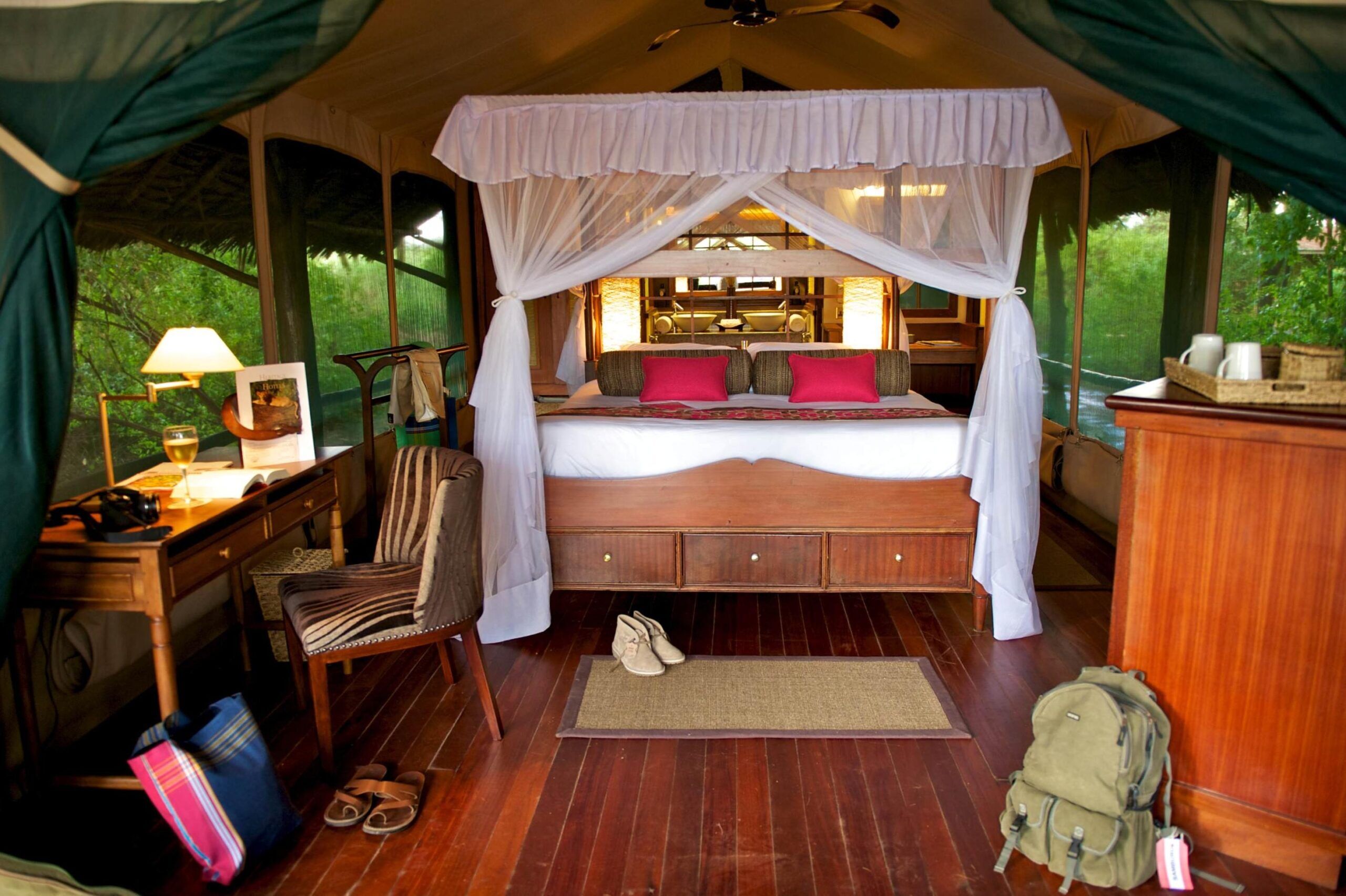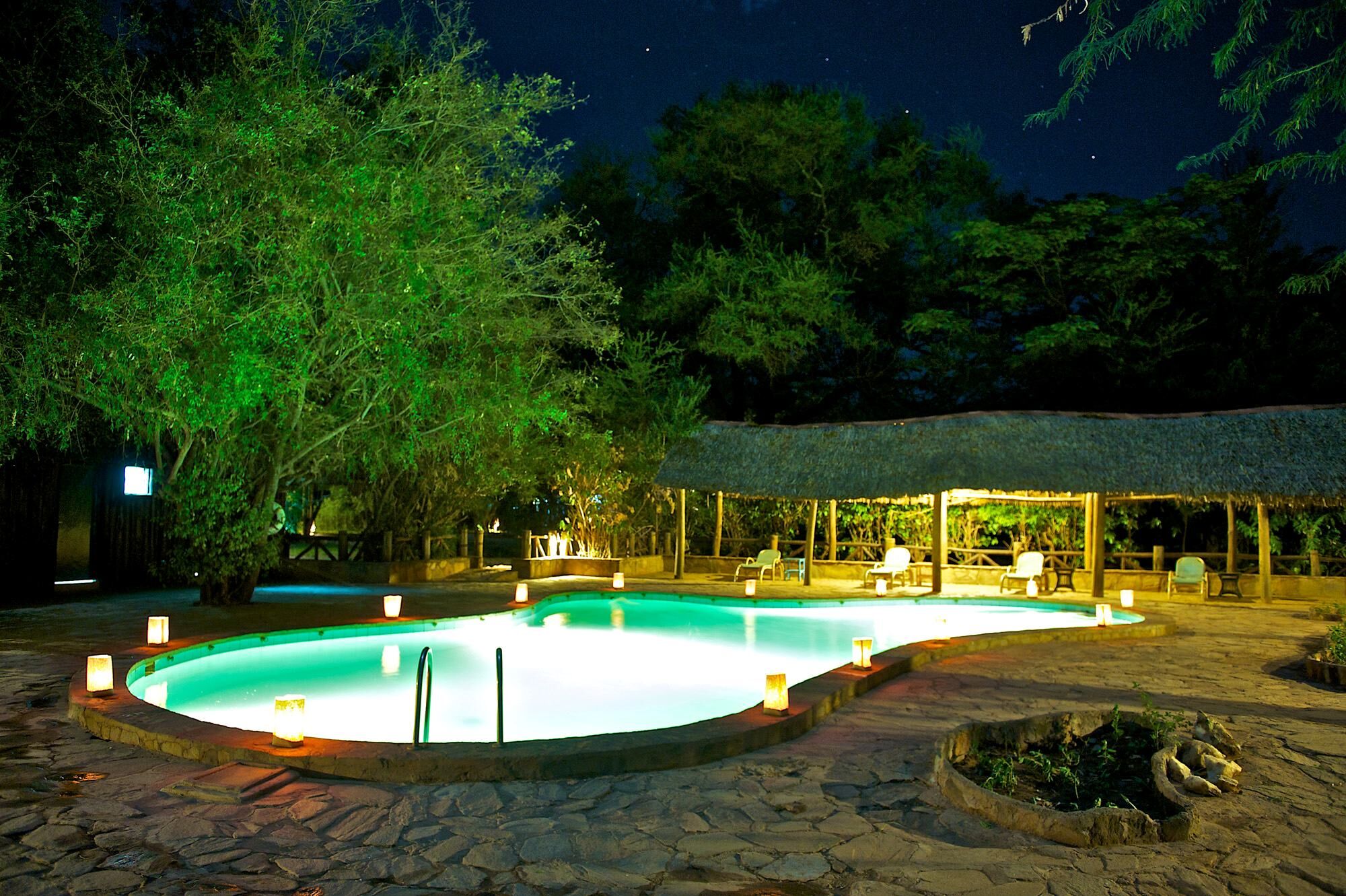 Dispone de 28 tiendas modernas y espaciosas, con un porche privado desde el que disfrutar de unas vistas impresionantes al río. Las habitaciones tienen un estilo rústico y están bien equipadas con cómodas camas, armarios, escritorios y cuartos de baño privados con duchas de agua caliente. En definitiva, ¡este alojamiento lo tiene todo! Como zonas comunes tiene un restaurante que también presume de un estilo tradicional y acogedor, con mobiliario de madera en el que se sirven deliciosas comidas y una piscina perfecta para refrescarse y para contemplar el asombroso cielo africano. Además, al estar tan cerca del ecuador, el cielo estrellado por la noche es fascinante.