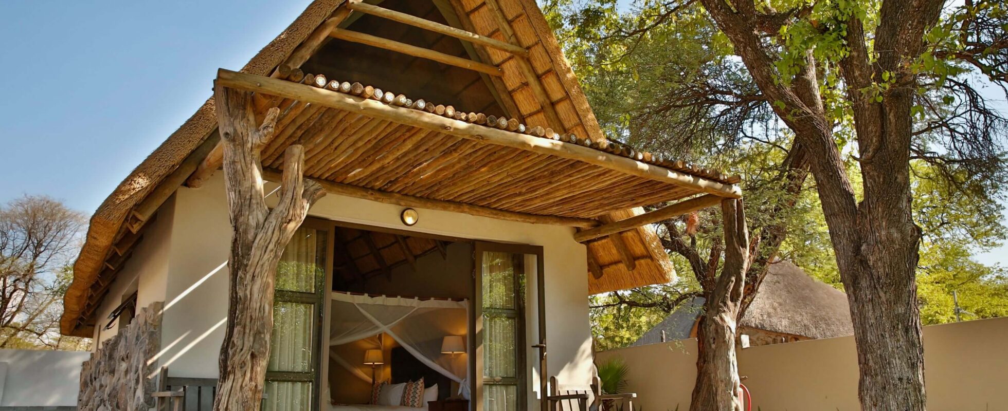 A solo 19 kilómetros del aeropuerto internacional de Maun, en la carretera que lleva a la reserva natural de Moremi, el Thamalakane River Lodge cuenta con chalés de piedra y paja con vistas al río Thamalakane, bordeado de juncos (¡no pierda de vista a los hipopótamos!). Puede elegir entre 32 chalés para dos personas o dos unidades familiares, todos equipados con cuarto de baño privado, ducha y mosquiteras para mantener a raya a los zumbadores invitados. La piscina le permitirá refrescarse, mientras que el restaurante sirve comidas a la carta inspiradas en ingredientes de temporada. Con los chalés y las zonas comunes frente al agua, las tardes ofrecen unas vistas panorámicas del río mientras las aves acuáticas se acomodan para pasar la noche.