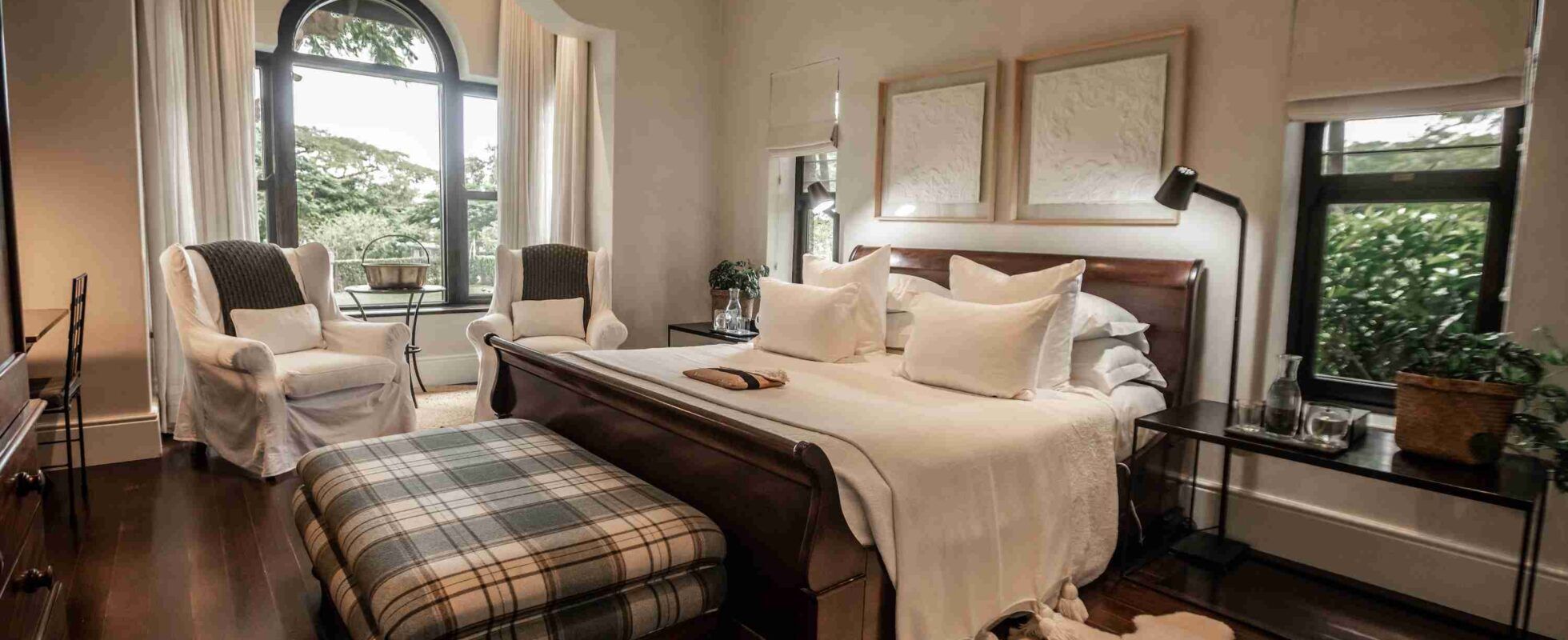 Torburnlea Homestead Luxury Accommodation se encuentra en el corazón de la zona de Kruger y Lowveld, y es conocido por su belleza natural y las oportunidades que ofrece para avistar animales. Esta hermosa casa de campo restaurada cuenta con un total de siete habitaciones, todas ellas con camas de matrimonio extragrandes, aire acondicionado, baños privados (algunos con bañeras exentas y otros con duchas a ras del suelo) y pequeños detalles para que te sientas como en casa: bolsa de calor para el estómago, mantas eléctricas y biscotes. Hay desayunos llenos de sabor disponibles todas las mañanas y cenas de tres platos solo los martes y los sábados. Las habitaciones del altillo incluyen espacio adicional para que duerman los niños y una pequeña cocina.