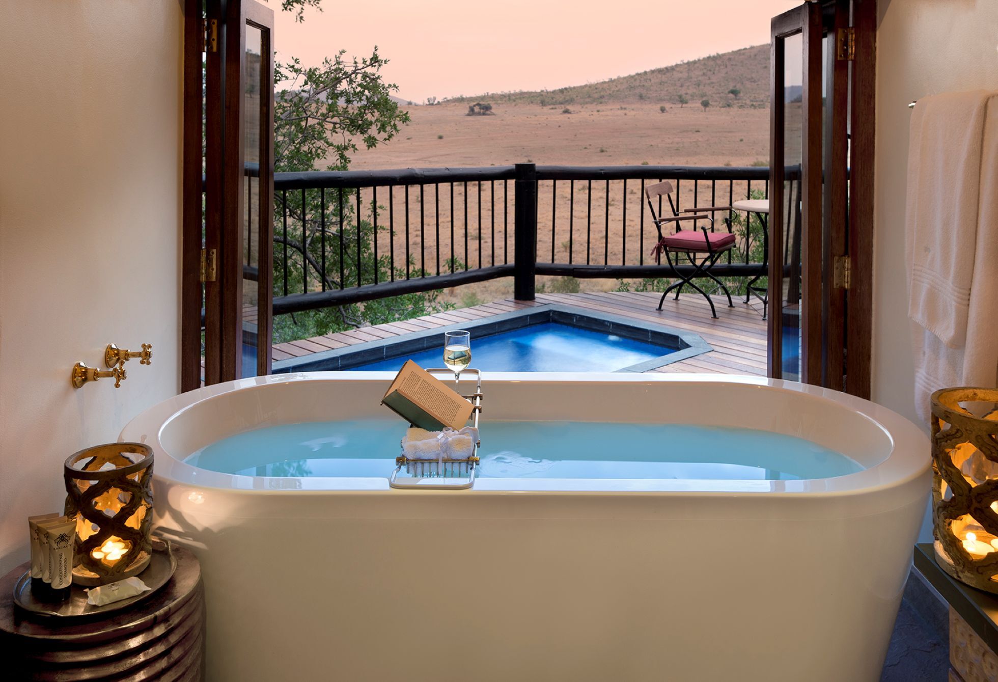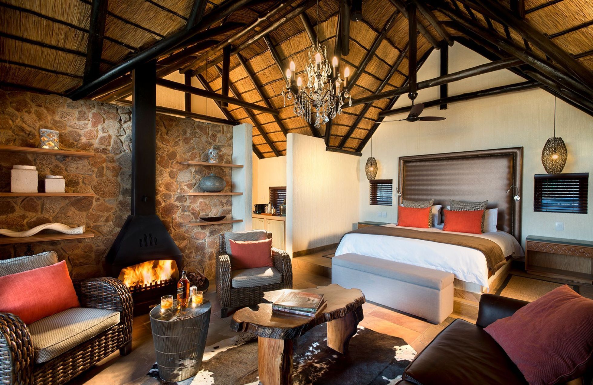 Tshukudu Bush Lodge se encuentra en el Parque Nacional Pilanesberg, conocido por ser hogar de los Cinco Grandes y de muchos otros animales. Cuenta con diez chalés de lujo y suites enclavados en una ladera rocosa. Todas las habitaciones disponen de camas de matrimonio estándar o extragrandes, una terraza privada con vistas espectaculares a una charca, cuartos de baño con bañeras hundidas (con vistas a la sabana) y duchas de techo, una cama de día, un salón diáfano con chimenea y una pequeña piscina con tumbonas rodeada de muros de caña para mayor intimidad. En el comedor se sirven delicias culinarias para desayunar, merendar o cenar, ya sea en el interior, en la terraza o al aire libre, bajo el cielo estrellado. Se admiten niños a partir de los 12 años.