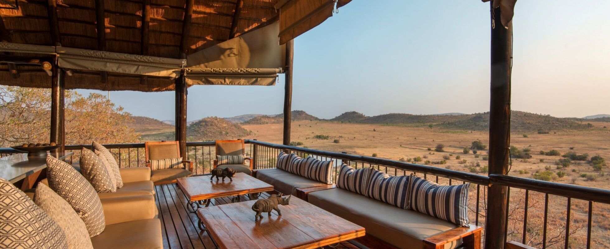 Tshukudu Bush Lodge se encuentra en el Parque Nacional Pilanesberg, conocido por ser hogar de los Cinco Grandes y de muchos otros animales. Cuenta con diez chalés de lujo y suites enclavados en una ladera rocosa. Todas las habitaciones disponen de camas de matrimonio estándar o extragrandes, una terraza privada con vistas espectaculares a una charca, cuartos de baño con bañeras hundidas (con vistas a la sabana) y duchas de techo, una cama de día, un salón diáfano con chimenea y una pequeña piscina con tumbonas rodeada de muros de caña para mayor intimidad. En el comedor se sirven delicias culinarias para desayunar, merendar o cenar, ya sea en el interior, en la terraza o al aire libre, bajo el cielo estrellado. Se admiten niños a partir de los 12 años.