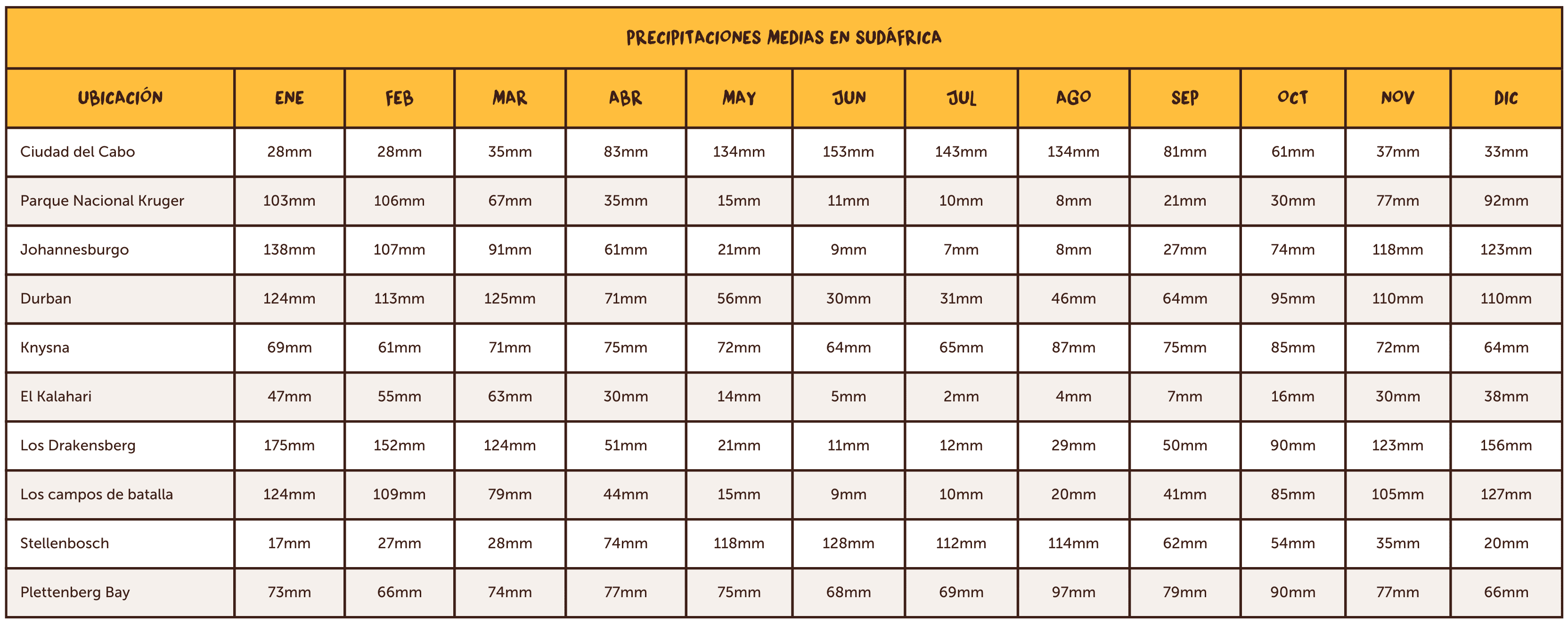 Durante la transición del verano al invierno, el clima en Sudáfrica cambia significativamente. En el Cabo Occidental, regiones como Ciudad del Cabo ven cómo las temperaturas medias descienden a unos 20ºC en mayo y bajan aún más, hasta los 17ºC, en junio y julio. Además, esta es una época de intensas lluvias en Ciudad del Cabo, con 134 mm en mayo y alcanzando el máximo de la temporada, 153 mm, en junio. En Johannesburgo, las temperaturas rondan los 20ºC en mayo, descendiendo a 17ºC en junio y julio, mientras que las precipitaciones disminuyen, con 21 mm en mayo y solo 9 mm en junio.