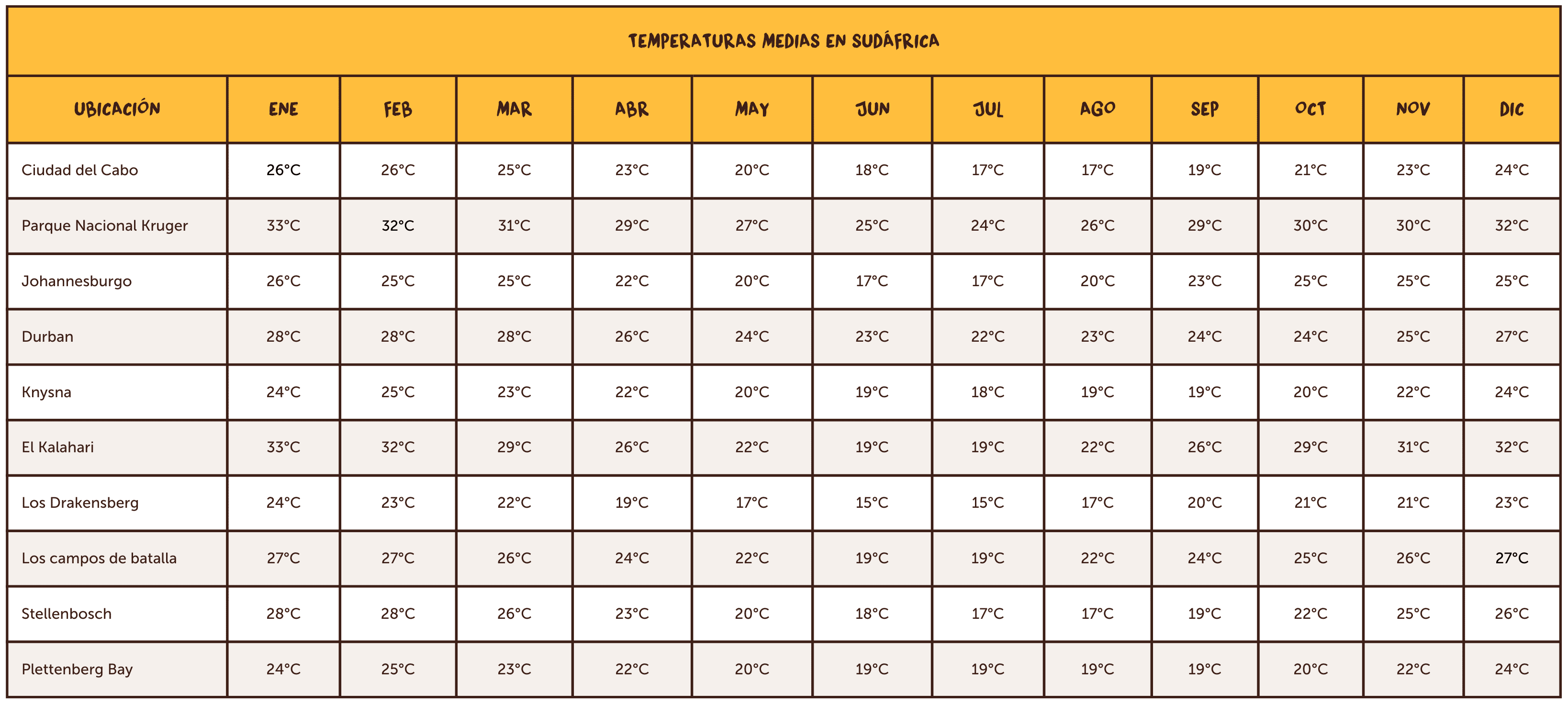 Octubre marca el inicio de la temporada cálida en Sudáfrica, especialmente en áreas como el Parque Transfronterizo de Kgalagadi, el Parque Nacional Richtersveld y el Parque Nacional Kruger, donde las temperaturas por la tarde pueden alcanzar los 31°C. Aunque es posible que haya lluvias en esta época, suelen ser breves y refrescantes, ayudando a mitigar el calor. Otros destinos recomendados para el verano son Durban y Pretoria, donde las temperaturas a menudo superan los 28ºC. Ciudad del Cabo también es una excelente opción para quienes disfrutan de días soleados, con temperaturas alrededor de los 26ºC en diciembre y enero. Esta época, generalmente seca y con brisa, es perfecta para disfrutar de la playa o hacer senderismo en la Montaña de la Mesa.