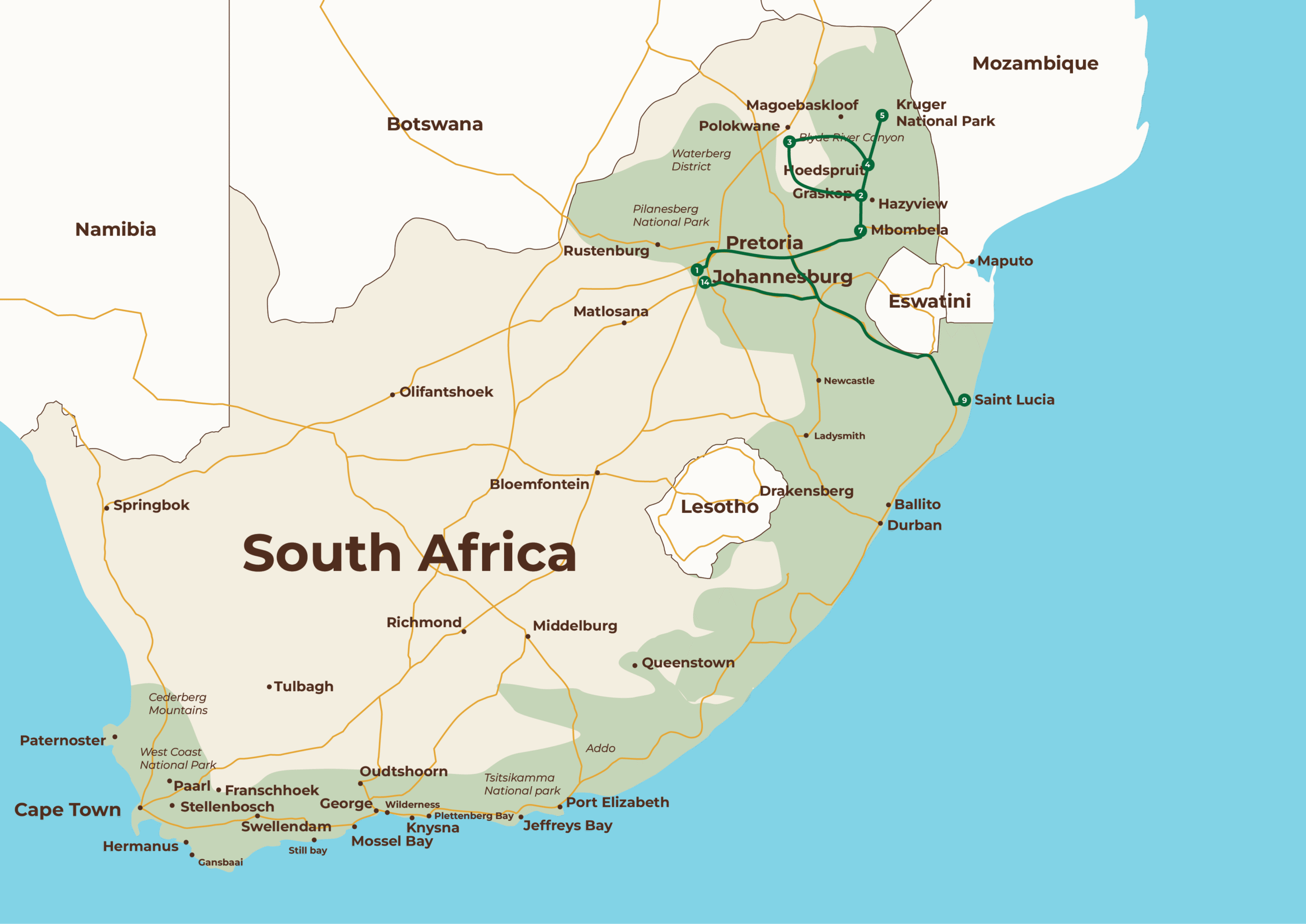 El viaje termina en Santa Lucía, un pueblo encantador declarado Patrimonio de la Humanidad por la UNESCO, donde hay bosque, fauna por descubrir, playas para relajarse y auténtica gastronomía sudafricana.