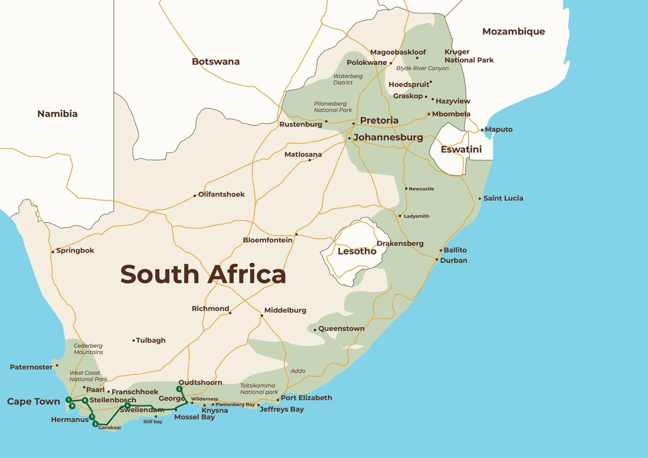 Arranca tu aventura en Sudáfrica con una cata de vinos en Robertson y pon rumbo a Oudtshoorn, en pleno corazón del Pequeño Karoo, tierra de granjas de avestruces, cuevas milenarias y emocionantes safaris.