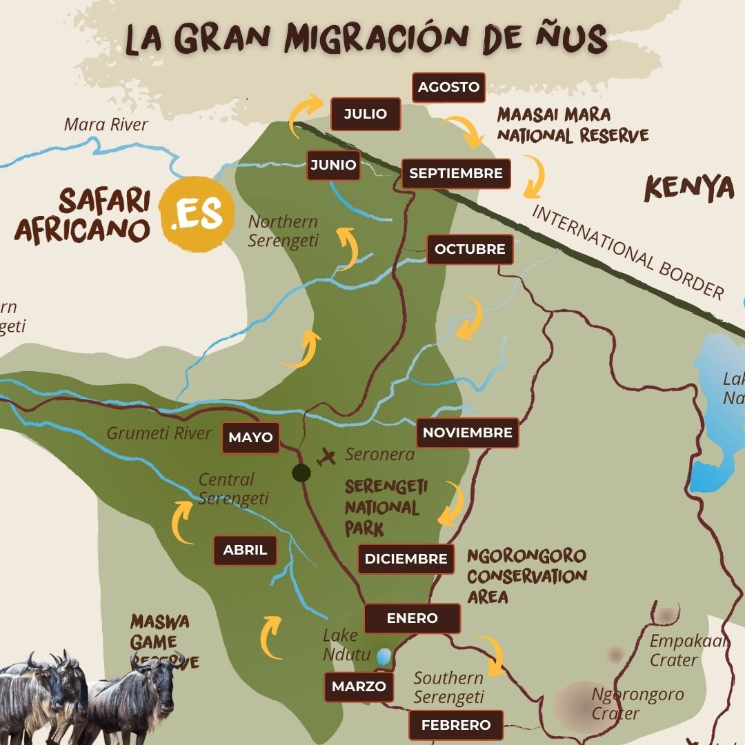 La Gran Migración de ñus es un fenómeno natural que no reconoce fronteras. A partir de enero, los rebaños se encuentran en la parte sur del Parque Nacional del Serengueti (Tanzania) hasta que, más tarde, se dirigen al norte, siguiendo las lluvias y las llanuras de pasto verde, hasta que cruzan la frontera con Kenia para llegar al Masai Mara, a finales de julio. Finalmente, recorren unos 800 kilómetros hacia el sur hasta cruzar la frontera de vuelta al Serengueti.